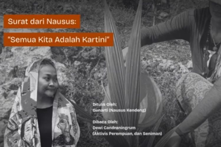Dalam video ini, Dewi Candraningrum, aktivis perempuan dan seniman, membacakan Surat Nausus berjudul “SEMUA KITA ADALAH KARTINI. Surat Terbuka dari Gunarti untuk Indonesia yang Sedang Merayakan Hari Kartini.” Surat ini ditulis oleh Gunarti, Nausus Kendeng, sebagai refleksi kritis atas cara kita memaknai peringatan Hari Kartini.